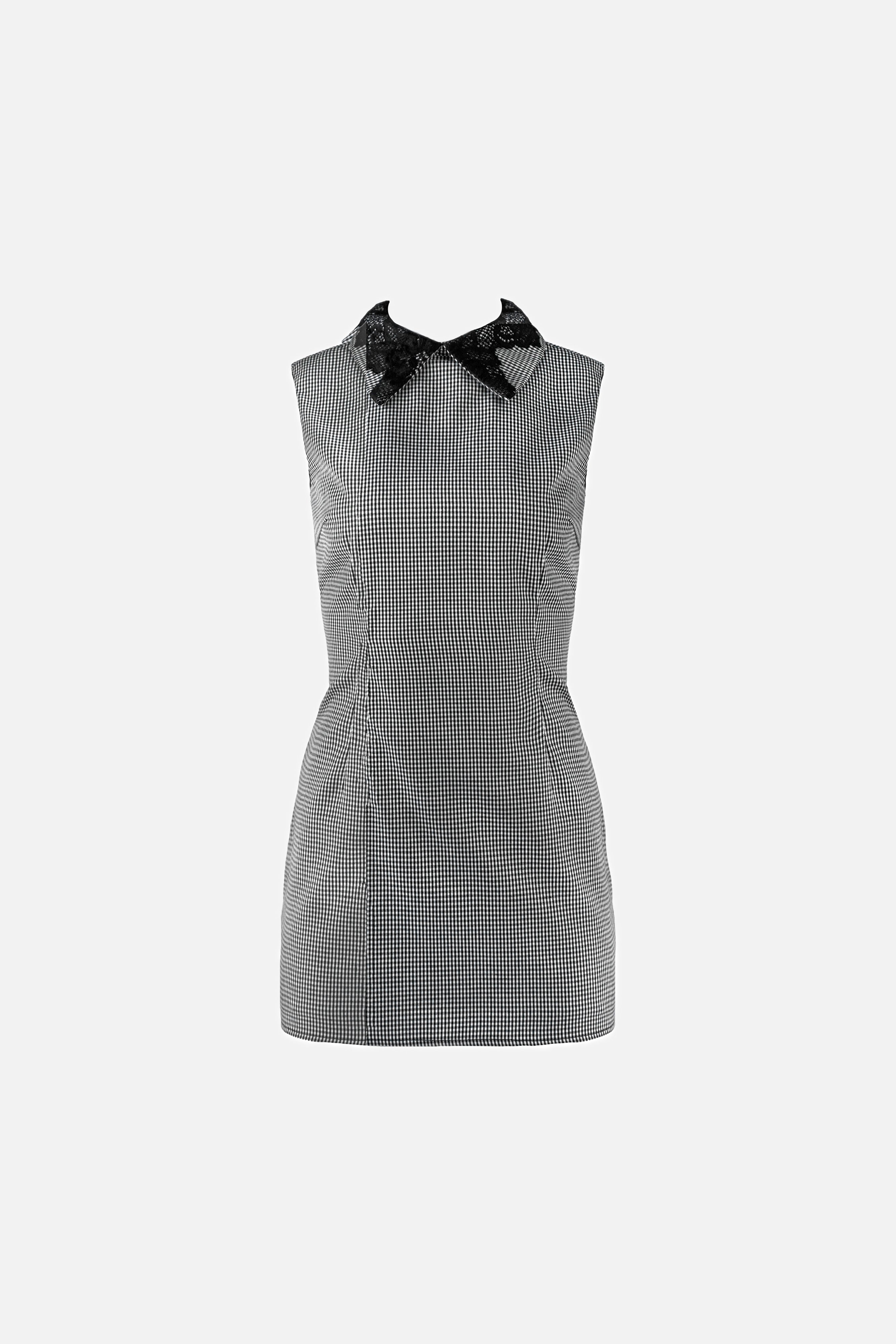 So sweet collared dress in a fitted, mini style with a checkered pattern. Designed with an intricate lace collar neckline, sleeveless, and a-line skirt.