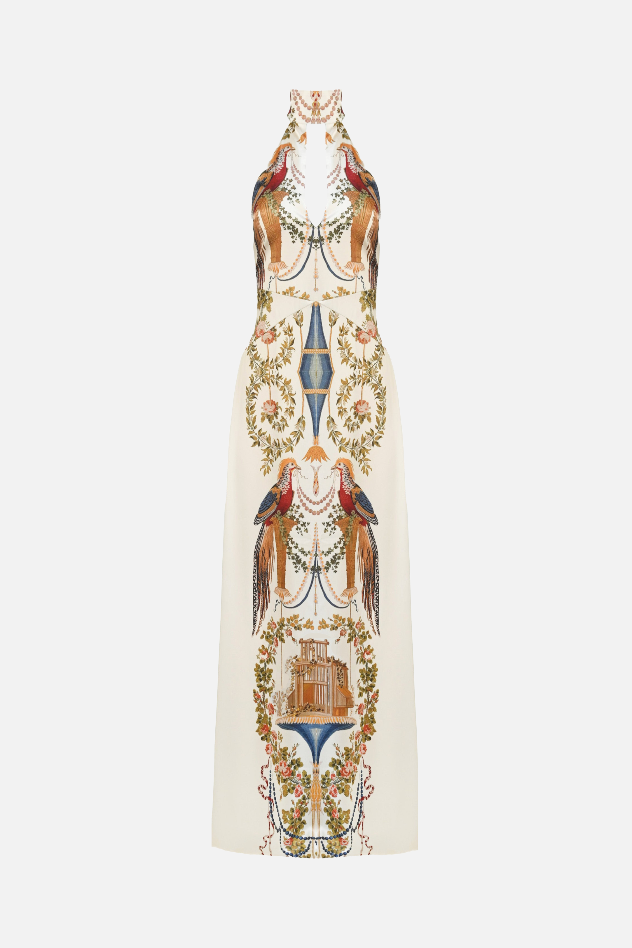 The Celeste Dress has artwork from a silk tapestry designed in 1779 by Jean Démosthène Dugourc as part of the "Verdures of the Vatican" series. The composition encompasses a lavish, symmetrical interplay of birds, garlands, and strings of pearls in rich tones.