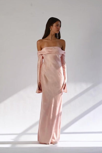 The Alma Dress is an off-the-shoulder gown with a sophisticated fold-over panel and precise seam detailing. Tapered sleeves finish elegantly at the wrist.