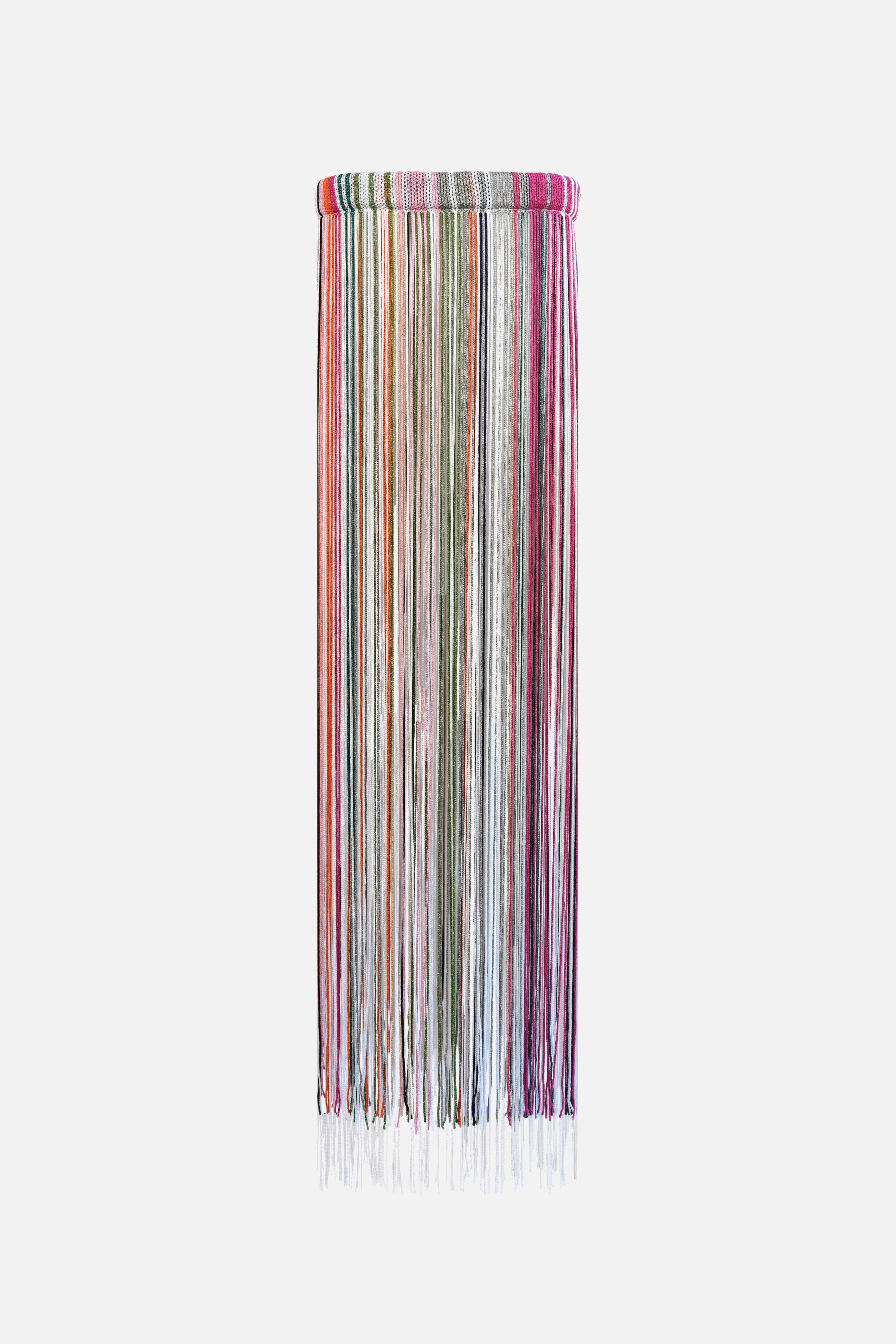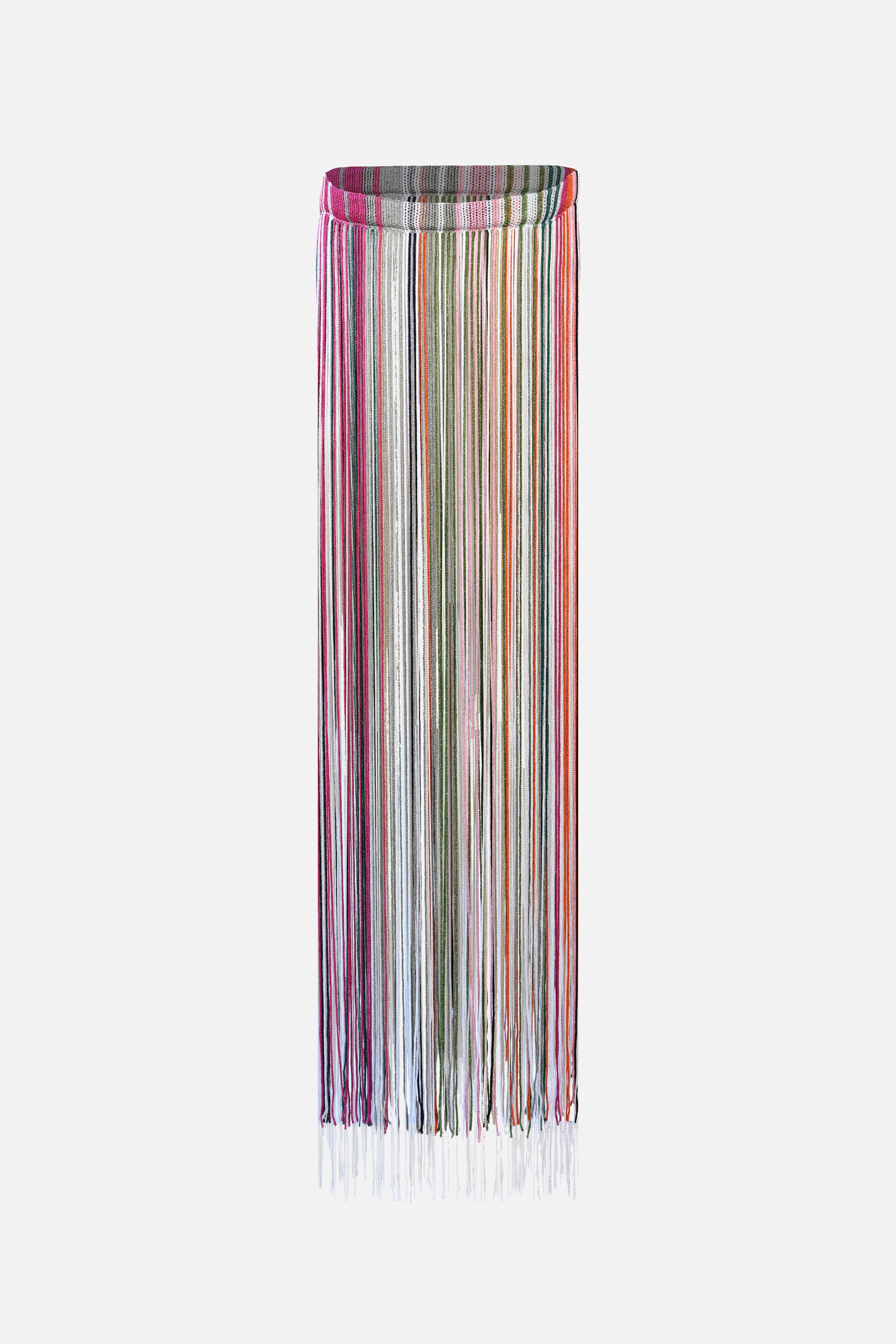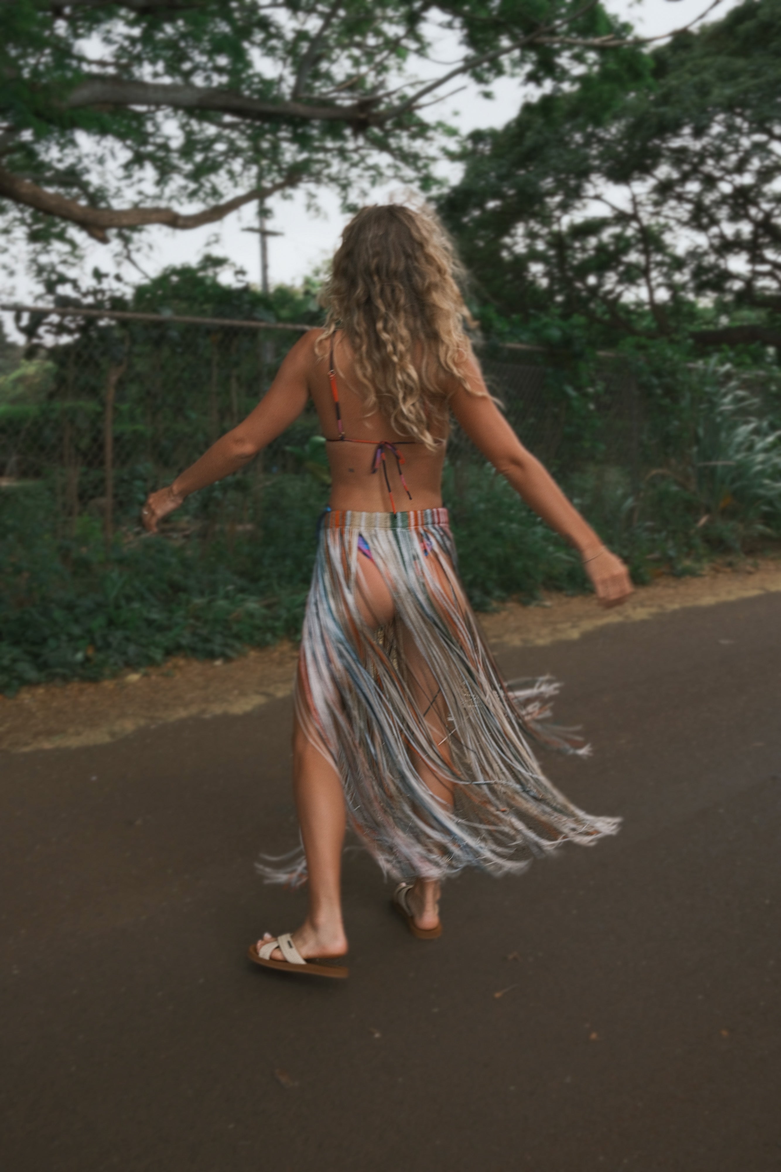 Our Bleu Skirt, an Italian-made swim coverup designed with shimmering metallic strings. The coverup has summer tones of pinks, blues, greens, and oranges built on top of a tan string layer. The waterfall of colors stream down the length of the skirt creating a movement of color.