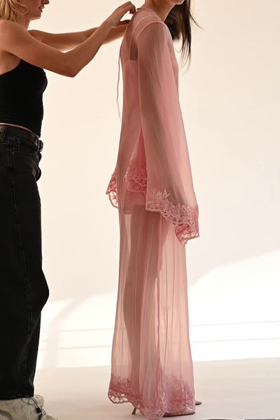 A two-piece set with an airy organza overlay maxi and a silky mini underneath. The Elowen Dress is finished with wide sleeves trimmed in delicate lace appliqué at the wrists and hem.