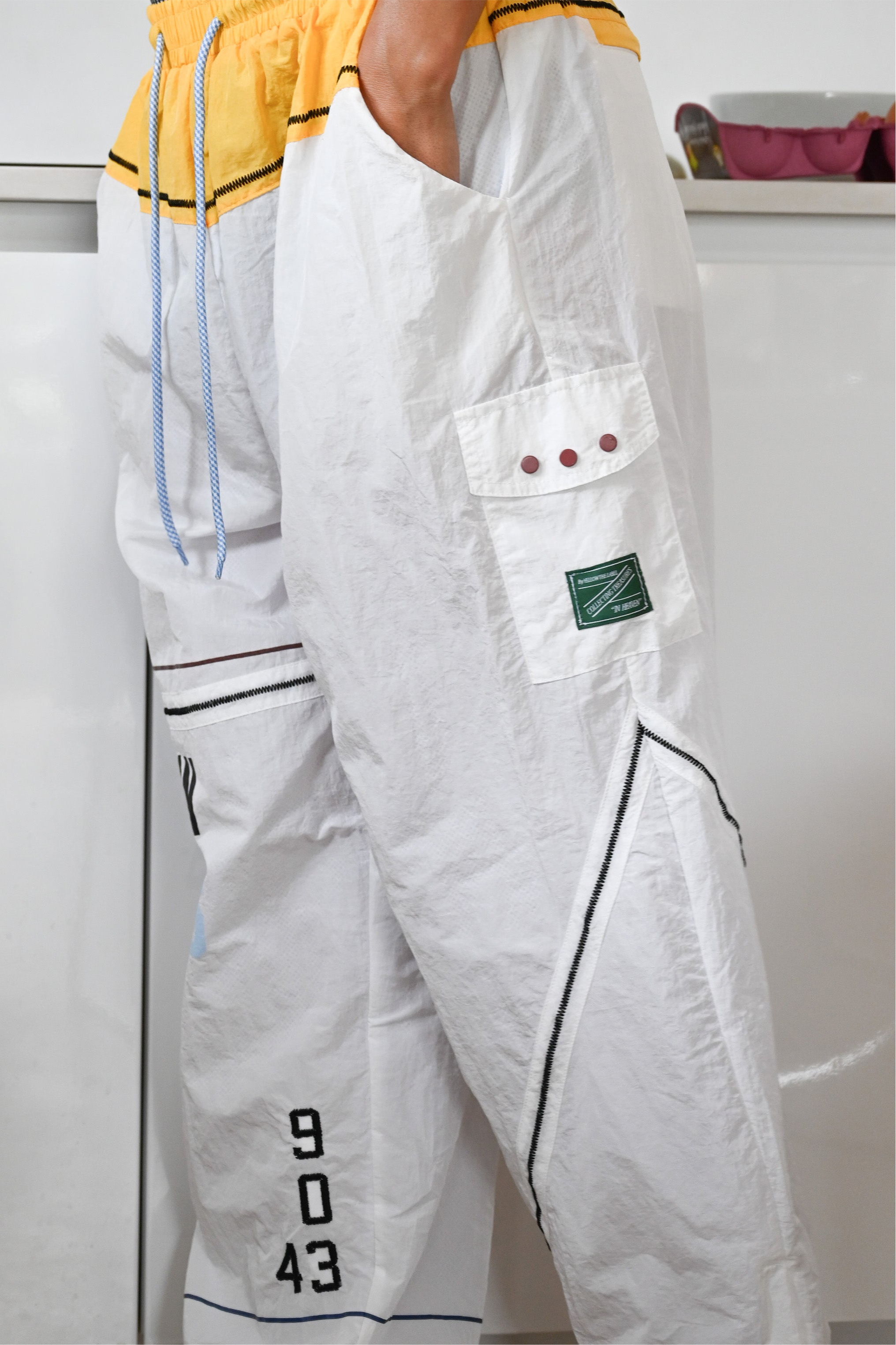 Inspired by a sail out of BVI, our Mast Joggers are a unisex-fit nylon jogger with various sail markings. Number markings are printed on the windbreaker material in light blue and black with thick stitches lining each leg.